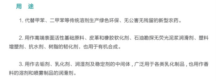 產(chǎn)品純度高,凝固點低,穩(wěn)定性強(qiáng),適配性優(yōu),乳化性好,具有優(yōu)良的分散性能,主要針對出口和新型制劑產(chǎn)品市場,由于本品滲透效果優(yōu)異,亦可適用于增效劑等產(chǎn)品。